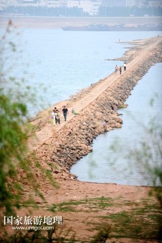 9月12日,行人走在攔水壩上。因水位下降,贛江南昌段的部分?jǐn)r水壩裸露在外。