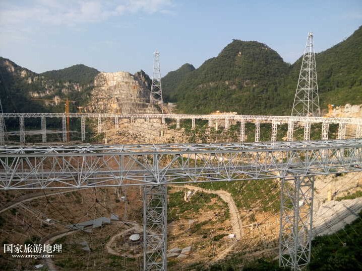 這是黔南平塘縣正在建設(shè)的大射電望遠(yuǎn)鏡,也稱 FAST,預(yù)計(jì)將于明年九月建成。FAST具有中國獨(dú)立自主知識產(chǎn)權(quán),是世界上正在建造及計(jì)劃中的口徑最大、最具威力的單天線射電望遠(yuǎn)鏡,其設(shè)計(jì)綜合體現(xiàn)了我國高技術(shù)創(chuàng)新能力。500米口徑球面射電望遠(yuǎn)鏡是利用貴州喀斯特地區(qū)的洼坑作為望遠(yuǎn)鏡臺址,建造世界第一大單口徑射電望遠(yuǎn)鏡,其擁有30個標(biāo)準(zhǔn)足球場大的接收面積。FAST作為世界最大的單口徑望遠(yuǎn)鏡,將在未來20至30年保持世界一流地位。
