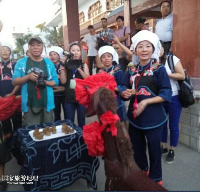 這是黔南惠水縣好花紅布依風(fēng)情寨,為了歡迎遠(yuǎn)方客人的到來,布依族人在寨門前擺滿酒杯唱起山歌。在進(jìn)寨前客人都要喝三杯攔門酒,喝完才能進(jìn)入寨中。同時,布依族習(xí)俗中,遠(yuǎn)方客人到來,坐上木馬,喝完三杯米酒也寓意著會交好運(yùn)。